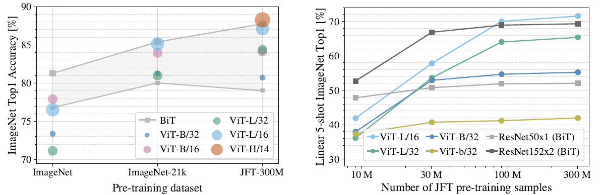 º ViT의 성능이 아직 포화(Saturate) 되지 않음 → 성능이 더 좋아질 수 있음