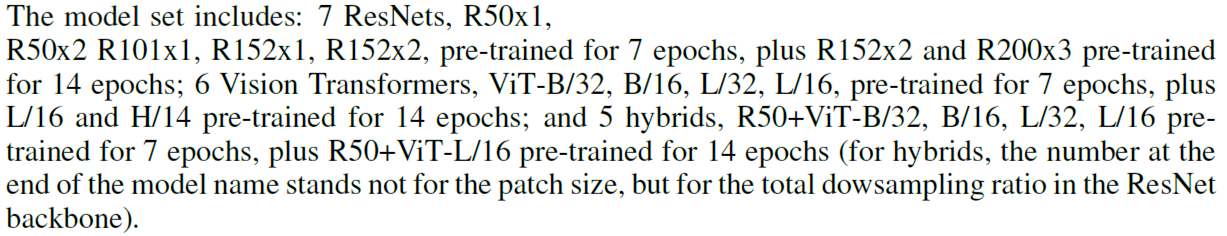 - Transformer, Hybrid, BiT의 모델 크기 실험 → Transfer Learnig 실험